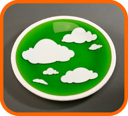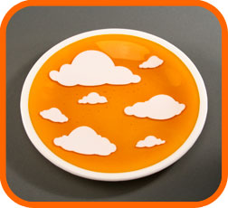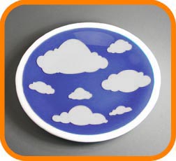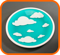 It's like eating dessert in the clouds. A durable, fused glass plate, decorated with puffy cumulus clouds and small raindrop bubbles. These plates work well for dessert, cheese, or any small portions. They are so cute you will want to store them out in plain sight.